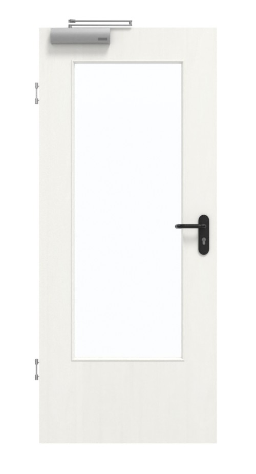 W pomieszczeniu wewnętrznym drzwi znajduje się solidna płyta wiórowa pełna w ramie z litego drewna ze stabilizatorem. Warstwa wierzchnia składa się z płyty HDF o grubości 3 mm. Wraz z samozamykaczem drzwiowym górnym i uszczelką dolną drzwi spełniają wymagania normy DIN 18095 dotyczącej drzwi dymoszczelnych.