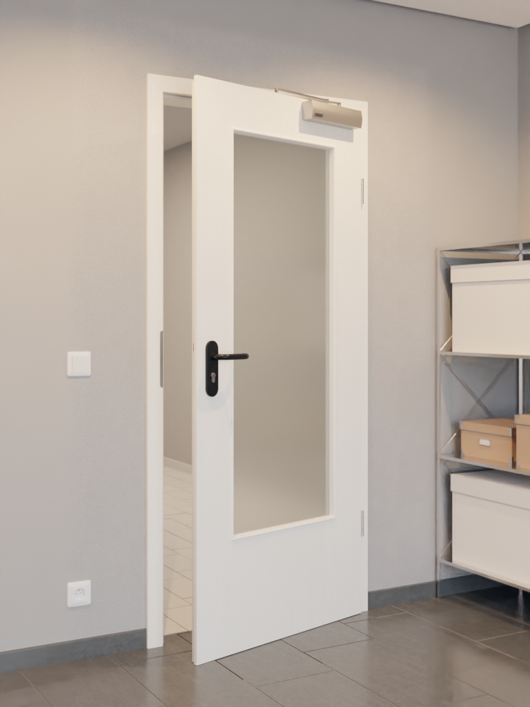Standardowy zakres dostawy obejmuje skrzydło drzwiowe, klamkę z tworzywa sztucznego, zamek PZ, dwa trzyczęściowe zawiasy, samozamykacz drzwiowy górny i opuszczaną uszczelkę podłogową.