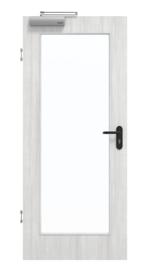 Skrzydło drzwiowe, zawiasy, zamek cylindryczny, przeszklenie, samozamykacz, obniżana uszczelka podłogowa, czarny plastikowy uchwyt.