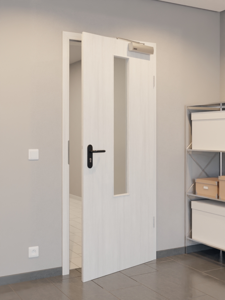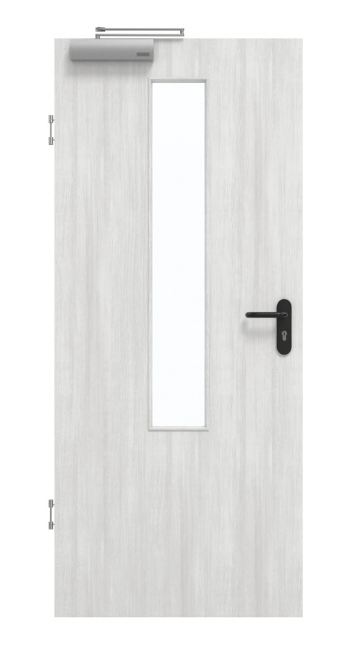 Konstrukcja składa się z płyty wiórowej oraz ramy z litego drewna z stabilizatorem. 3 mm grubości płyta HDF dopełnia wnętrze drzwi. Zgodnie z normą DIN 18095, model uzupełniają górny samozamykacz oraz opadająca uszczelka podłogowa.