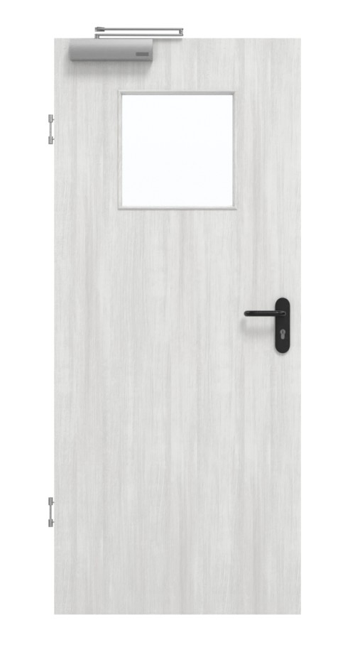 Przeszklenie w górnej części drzwi nadaje projektowi prosty wygląd. Jasnoszary kolor z delikatnymi odcieniami rozciąga się wzdłuż skrzydła drzwi. Łatwą w czyszczeniu powierzchnię CPL można szybko przetrzeć, a także wytrzymuje uderzenia i zarysowania.