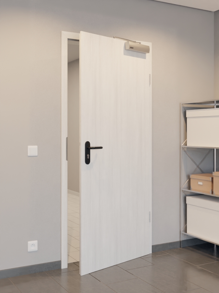 Konstrukcja składa się z okładziny HDF na płycie pełnej w stabilizującym ramie z litego drewna. Całość jest zgodna z DIN 18095 dla drzwi przeciwpożarowych i uzupełniona o samozamykacz oraz opadającą uszczelkę podłogową.