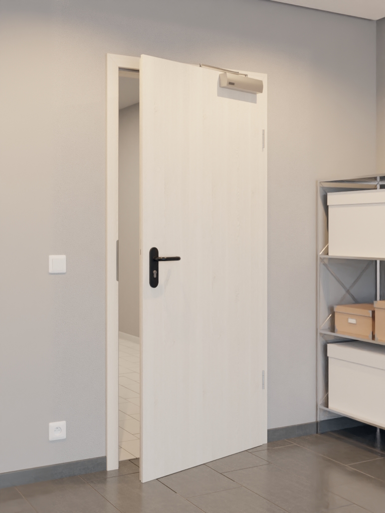 Ta zaawansowana technicznie konstrukcja posiada wewnątrz ramę z litego drewna wraz ze stabilizatorem i płytą wiórową, a całość jest pokryta płytą wierzchnią HDF o grubości 3 mm. Zgodnie z normą DIN 18095 drzwi zamykają się samoczynnie dzięki górnemu samozamykaczowi i są uszczelnione względem podłogi za pomocą standardowo montowanego uszczelniacza Schallex.