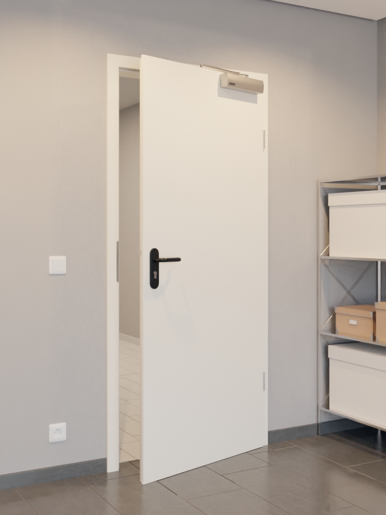 Robustne drzwi przeciwpożarowe w białym lakierze z pełną płytą wiórową i ramą z litego drewna: