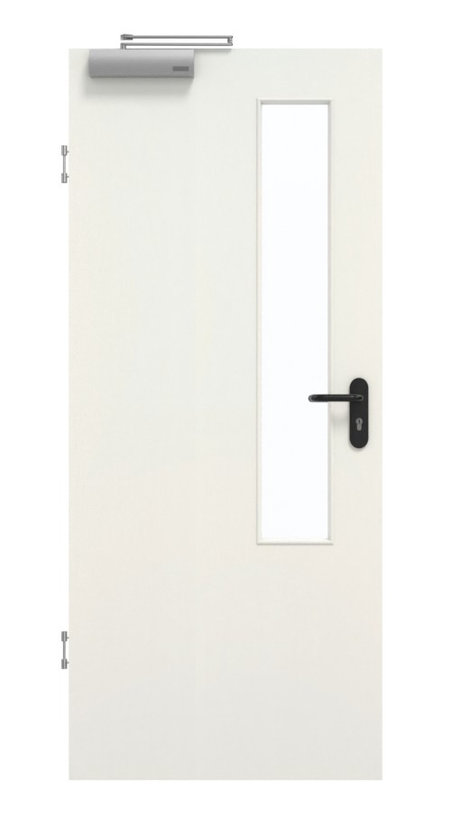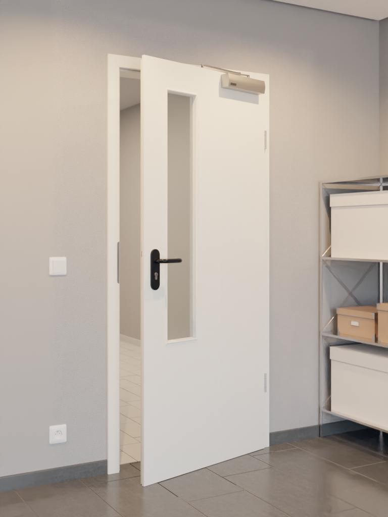 W pomieszczeniu wewnętrznym drzwi znajduje się solidna płyta wiórowa pełna w ramie z litego drewna ze stabilizatorem. Warstwa wierzchnia składa się z płyty HDF o grubości 3 mm. W połączeniu z samozamykaczem drzwiowym górnym i opuszczaną uszczelką podłogową drzwi spełniają wymagania normy DIN 18095 dla drzwi dymoszczelnych.