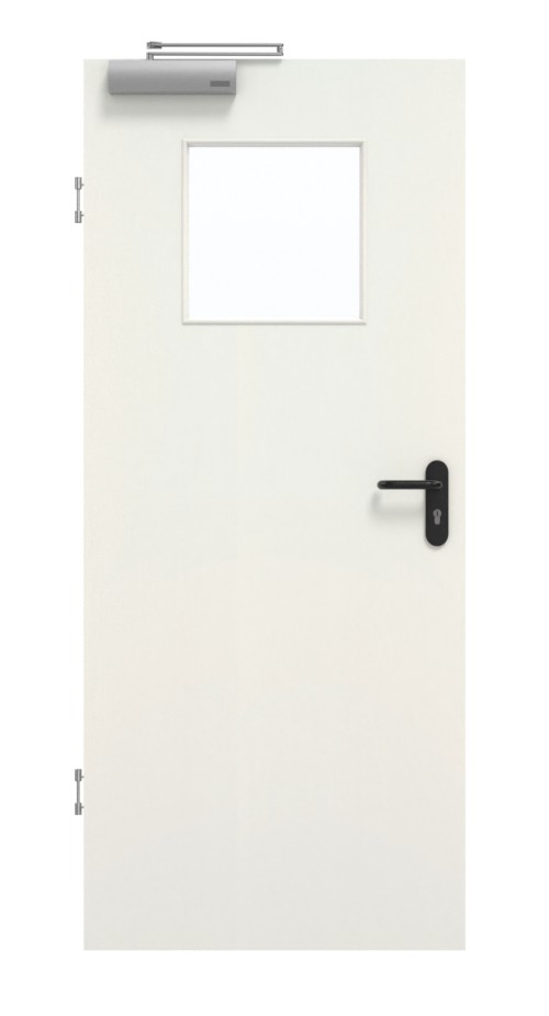 Standardowy zakres dostawy obejmuje skrzydło drzwiowe, klamkę z tworzywa sztucznego, zamek PZ, dwa trzyczęściowe zawiasy, samozamykacz nożycowy do drzwi górnych oraz uszczelkę dolną.