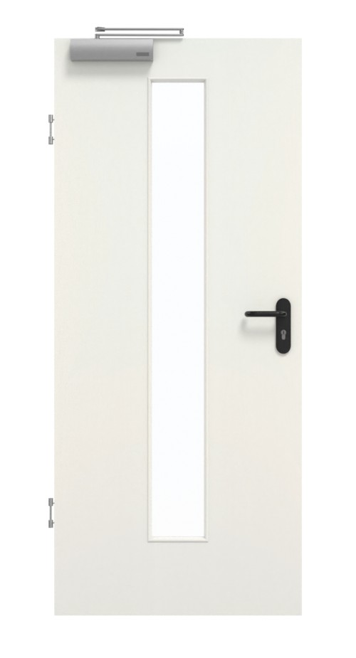 Wnętrze drzwi wyposażone jest w płytę wiórową pełną, ramę z drewna litego ze stabilizatorem oraz płytę wierzchnią HDF o grubości 3 mm. Konstrukcja jest zgodna z normą DIN 18095 dotyczącą drzwi dymoszczelnych i jest zaokrąglona poprzez zastosowanie samozamykacza drzwiowego górnego oraz uszczelki dolnej.