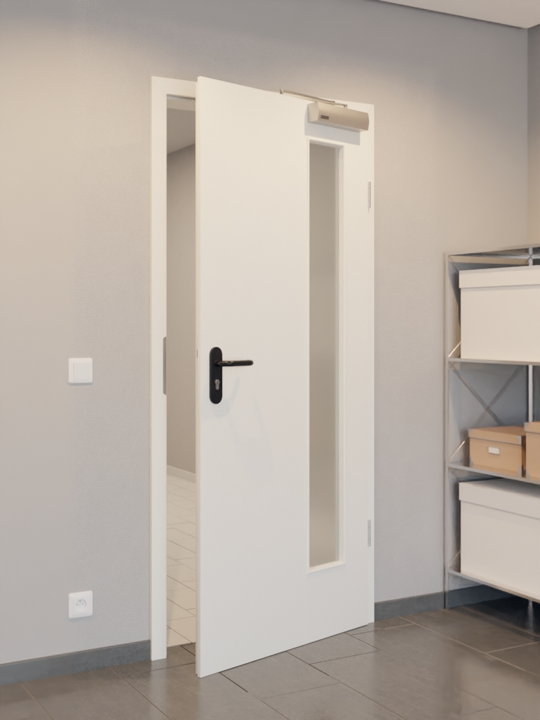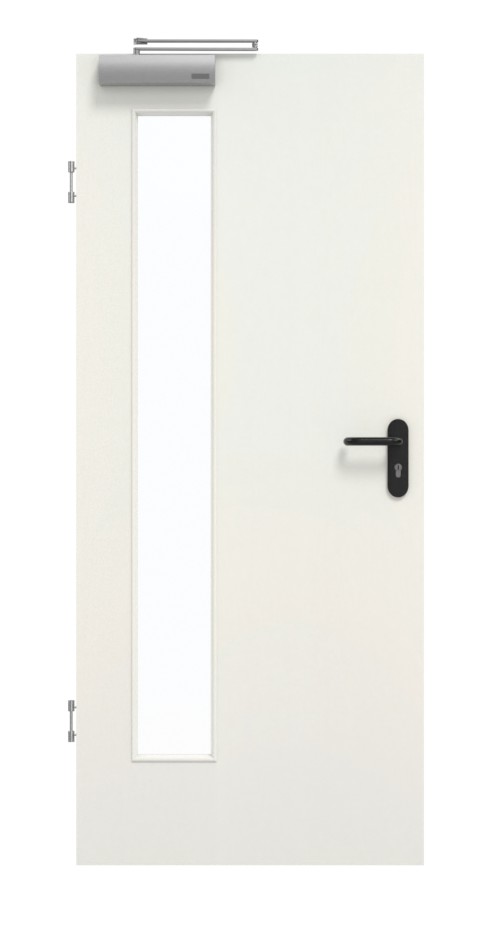 Wykorzystano tutaj płytę wiórową pełną w ramie z litego drewna ze stabilizatorem oraz płytę HDF o grubości 3 mm jako warstwę wierzchnią. Dzięki samozamykaczowi drzwiowemu górnemu i opuszczanej uszczelce podłogowej drzwi spełniają wymagania normy DIN 18095 dotyczące drzwi dymoszczelnych.