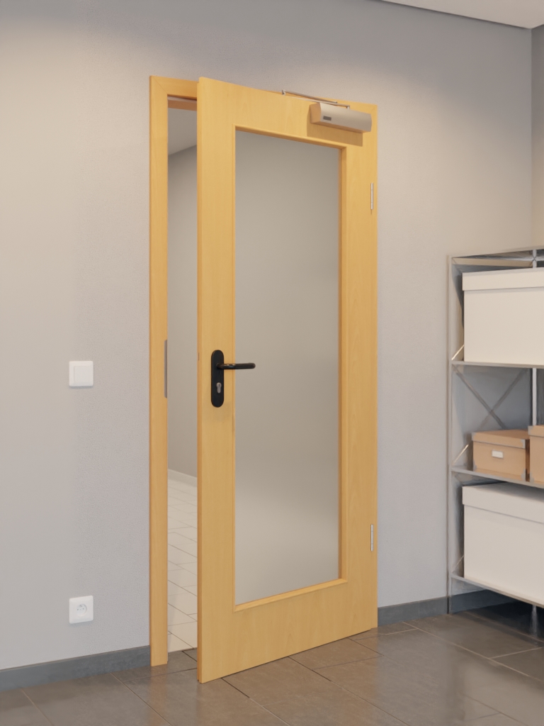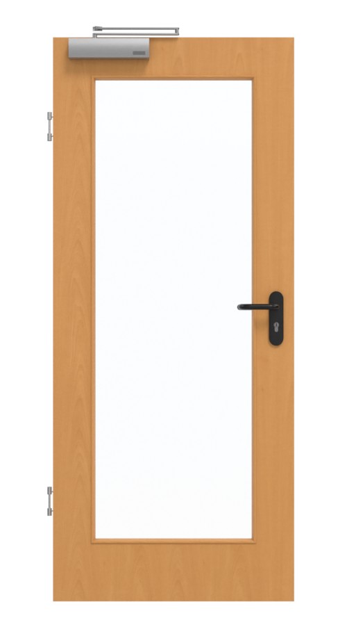 Konstrukcja składa się z płyty wiórowej oraz ramy z litego drewna z stabilizatorem. 3 mm grubości płyta HDF dopełnia wnętrze drzwi. Zgodnie z normą DIN 18095 dla drzwi przeciwpożarowych, konstrukcję uzupełniają górny zamykacz drzwi oraz opadająca uszczelka podłogowa.