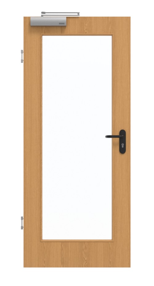 Stabilność wewnętrzną zapewnia konstrukcja z ramą z litego drewna z stabilizatorem oraz płytą pełno wiórową. Jako pokrycie zastosowano płytę włóknistą o wysokiej gęstości o grubości 3 mm. Zgodnie z normą DIN 18095 dla drzwi dymoszczelnych, drzwi są uzupełnione o górny mechanizm zamykający oraz opadającą uszczelkę podłogową.