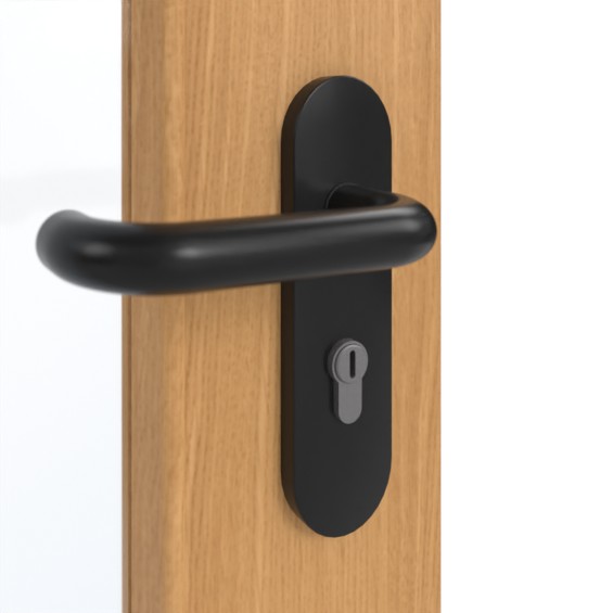 Standardowy zakres dostawy obejmuje skrzydło drzwiowe, plastikowy uchwyt, zamek PZ, dwa trójczęściowe zawiasy, górny mechanizm zamykający oraz uszczelkę podłogową.