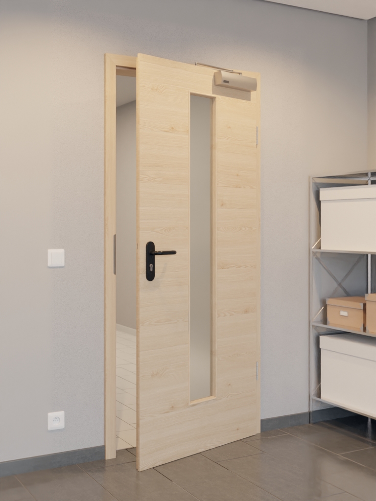 W standardowym zakresie dostawy znajduje się skrzydło drzwiowe, klamka z tworzywa sztucznego, zamek PZ, dwa trzyczęściowe zawiasy, samozamykacz nożycowy do drzwi górnych oraz opuszczana uszczelka podłogowa.