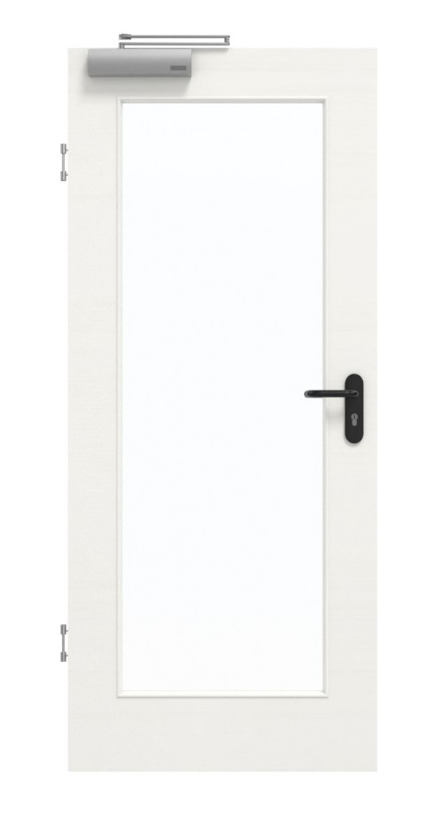 Skrzydło drzwiowe, zawiasy, zamek cylindryczny, przeszklenie, samozamykacz, obniżana uszczelka podłogowa, czarny plastikowy uchwyt.