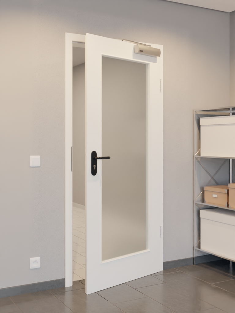 Dzięki dużemu otworowi okiennemu do pomieszczeń wpada dużo światła. Listwy szklane po bokach otaczają prostokąt. Na białym dekorze Authentic Bianco widoczne jest delikatne usłojenie w przekroju poprzecznym . Odporność powierzchni CPL na uderzenia i zarysowania podkreśla fakt, że drzwi te doskonale nadają się do użytku w domu rodzinnym.