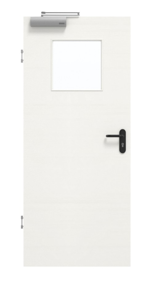 Standardowy zakres dostawy obejmuje skrzydło drzwiowe, klamkę z tworzywa sztucznego, zamek PZ, dwa trzyczęściowe zawiasy, samozamykacz drzwiowy górny i opuszczaną uszczelkę podłogową.