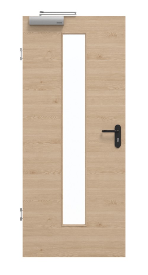 Wnętrze drzwi tworzy rama z litego drewna ze stabilizatorem oraz płyta wiórowa pełna. Konstrukcję wieńczy zaokrąglona warstwa wierzchnia z płyty HDF o grubości 3 mm. Zgodnie z normą DIN 18095 dotyczącą drzwi dymoszczelnych, kompletny zestaw uzupełnia samozamykacz drzwiowy górny i opuszczana uszczelka podłogowa.