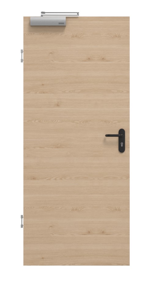 Drzwi są wykonane z ramy z drewna litego ze stabilizatorem i litej płyty wiórowej pełnej. Na konstrukcji znajduje się płyta HDF o grubości 3 mm, która stanowi warstwę wierzchnią. Samozamykacz drzwiowy górny i opuszczana uszczelka podłogowa sprawiają, że drzwi są zgodne z normą DIN 18095 dotyczącą drzwi dymoszczelnych.