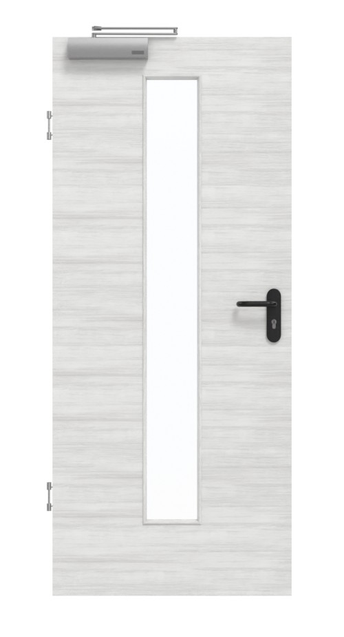 Pomieszczenie wewnętrzne drzwi składa się z ramy z drewna litego ze stabilizatorem, płyty wiórowej pełnej oraz warstwy wierzchniej z płyty pilśniowej o grubości 3 mm i wysokiej gęstości. Samozamykacz drzwiowy górny i opuszczana uszczelka podłogowa uzupełniają drzwi zgodnie z wymaganiami normy DIN 18095 dla drzwi dymoszczelnych.