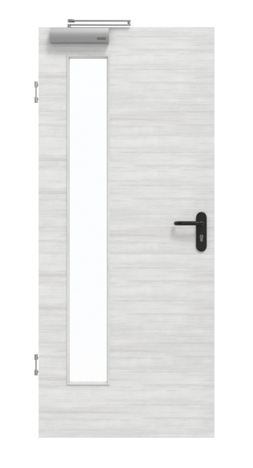 Wnętrze drzwi tworzy rama z litego drewna ze stabilizatorem oraz płyta wiórowa pełna. Konstrukcję wieńczy zaokrąglona warstwa wierzchnia z płyty HDF o grubości 3 mm. Zgodnie z normą DIN 18095 dotyczącą drzwi dymoszczelnych, kompletny zestaw uzupełnia samozamykacz drzwiowy górny i opuszczana uszczelka podłogowa.