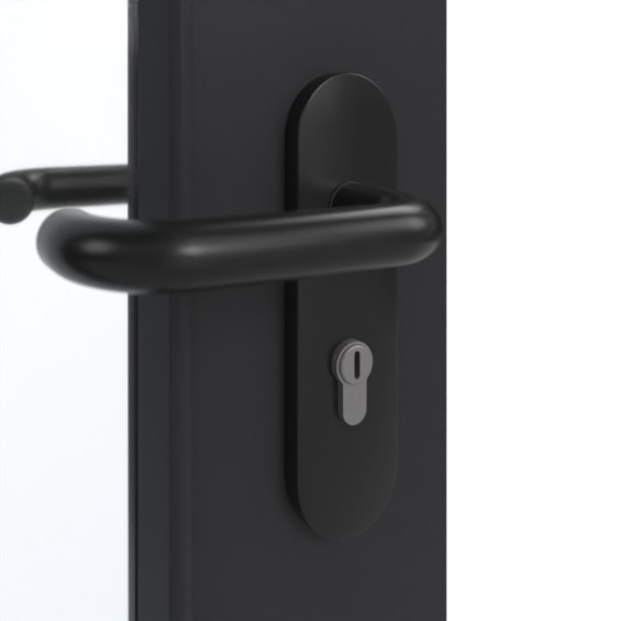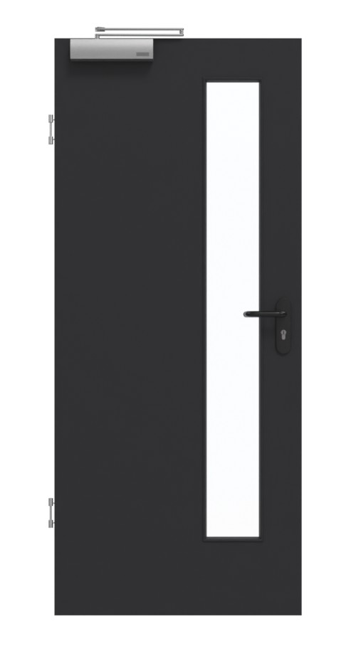 Po stronie zamka skrzydło drzwi zdobi smukły otwór okienny . Dzięki jednolitej kolorystyce i wykończeniu o wysokim stopniu matowości dekor G-TEC w kolorze czarnym RAL 9005 harmonijnie wtapia się w wnętrze. Ponadto powierzchnia posiada przyjemny efekt zapobiegający pozostawianiu odcisków palców .