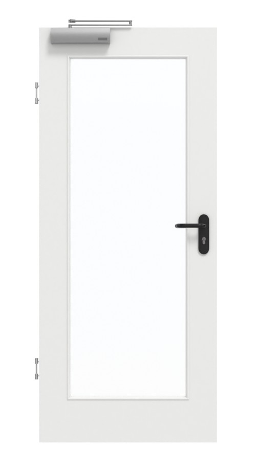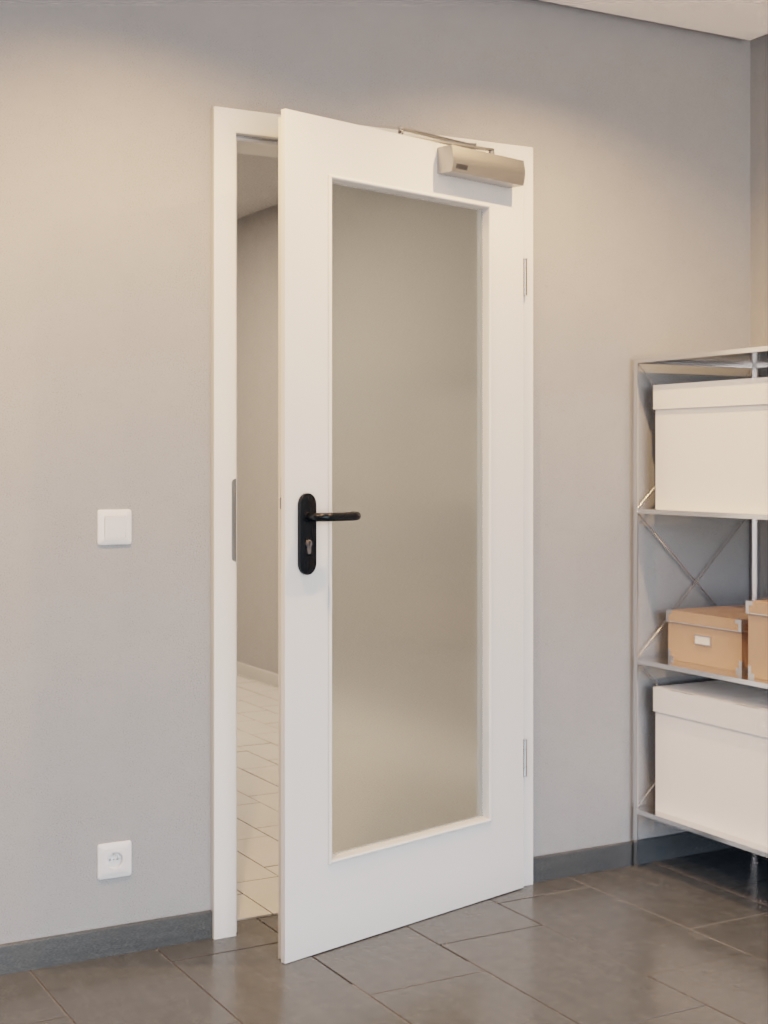 Duży, prostokątny otwór przeszklony w środkowej części drzwi nadaje pomieszczeniom jasny i przestronny charakter. Listwy szklane ze wszystkich czterech stron są zaokrąglone i dopełniają wykończenie wizualne. Nowoczesny wzór G-TEC w kolorze białym lakierowanym 9016ma szczególnie matowe wykończenie, dzięki czemu znacznie mniej widać na nim odciski palców.