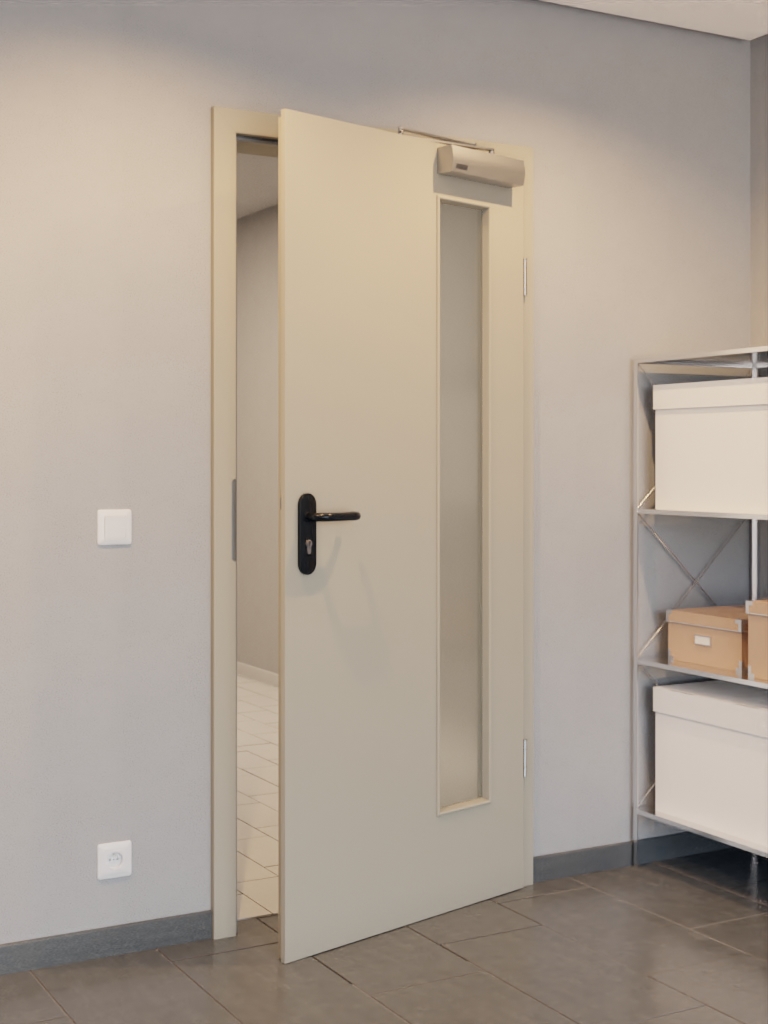 O stabilność dba konstrukcja składająca się z płyty wiórowej oraz ramy z litego drewna ze stabilizatorem. Jako warstwa wierzchnia stosowana jest płyta pilśniowa o grubości 3 mm i wysokiej gęstości. Zgodnie z normą DIN 18095 dotyczącą drzwi przeciwpożarowych model ten jest wyposażony w zamknięcie górne oraz opuszczaną uszczelkę podłogową .