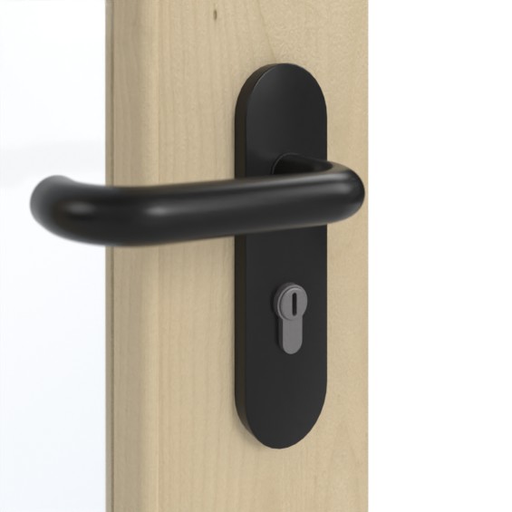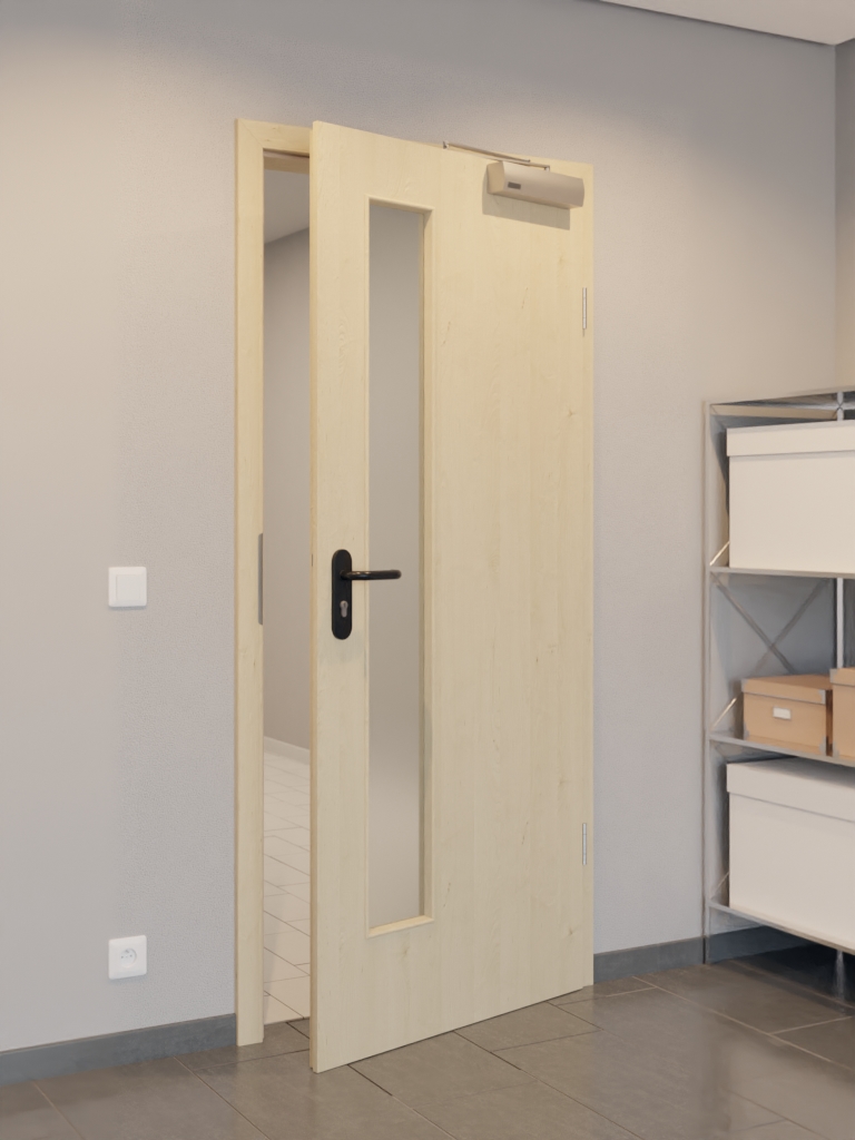 Oprócz skrzydła drzwiowego standardowy zakres dostawy obejmuje plastikową klamkę, zamek PZ, dwa trzyczęściowe zawiasy, nożycowy zamykacz górny oraz opuszczaną uszczelkę podłogową.
