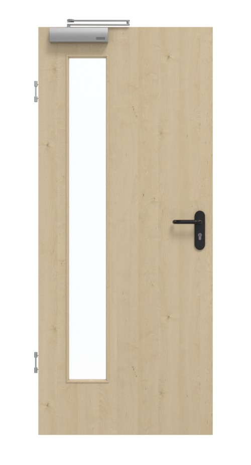 Design charakteryzuje się smukłym przeszkleniem po stronie zawiasów skrzydła drzwiowego. Na jasnym dekorze Natura Ahorn wyczuwalne są drobne usłojenia. Dzięki wysokiej odporności na uderzenia i zarysowania łatwa w czyszczeniu powierzchnia CPL wytrzymuje nawet intensywne użytkowanie.