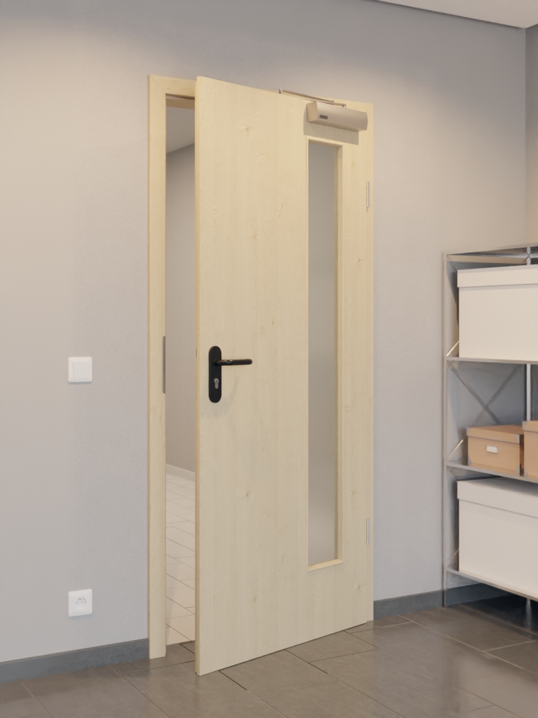 Model jest zbudowany z solidnej ramy z drewna litego ze stabilizatorem i solidnej płyty wiórowej pełnej. Warstwa wierzchnia składa się z płyty HDF o grubości 3 mm. Wraz z samozamykaczem drzwiowym górnym i uszczelką dolną drzwi spełniają wymagania normy DIN 18095 dotyczącej drzwi dymoszczelnych.