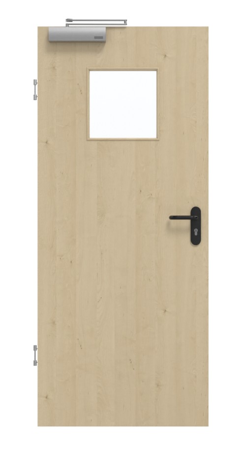 Na skrzydle drzwiowym na wysokości oczu umieszczono kwadratowe wycięcie na szybę. Harmonijne usłojenia z niewielką ilością gałęzi podkreślają naturalny wygląd drewna dekoru Natura Ahorn. Odporność powierzchni CPL na uderzenia i zarysowania podkreśla rodzinny charakter drzwi.