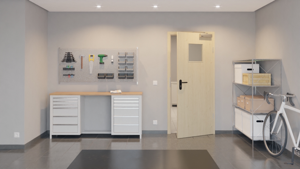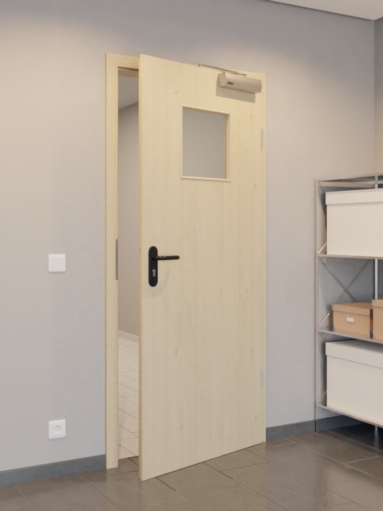 W pomieszczeniu wewnętrznym drzwi znajduje się solidna płyta wiórowa pełna w ramie z litego drewna ze stabilizatorem. Warstwa wierzchnia składa się z płyty HDF o grubości 3 mm. W połączeniu z samozamykaczem drzwiowym górnym i opuszczaną uszczelką podłogową drzwi spełniają wymagania normy DIN 18095 dla drzwi dymoszczelnych.