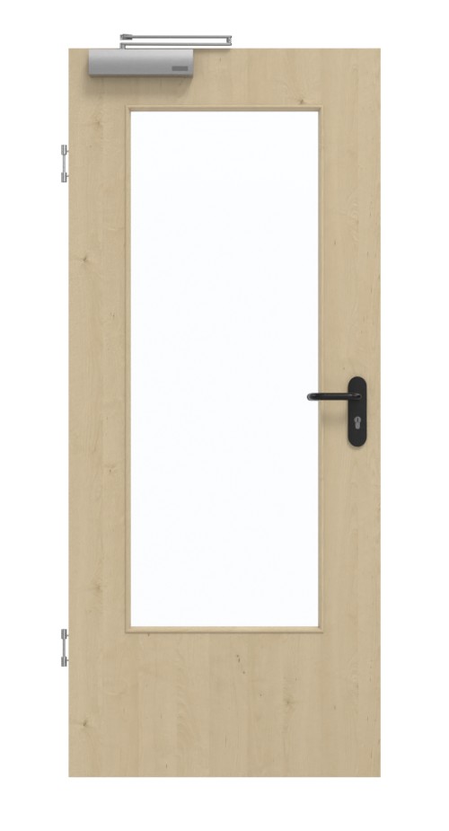 Skrzydło drzwiowe, zawiasy, zamek cylindryczny, przeszklenie, samozamykacz, obniżana uszczelka podłogowa, czarny plastikowy uchwyt.