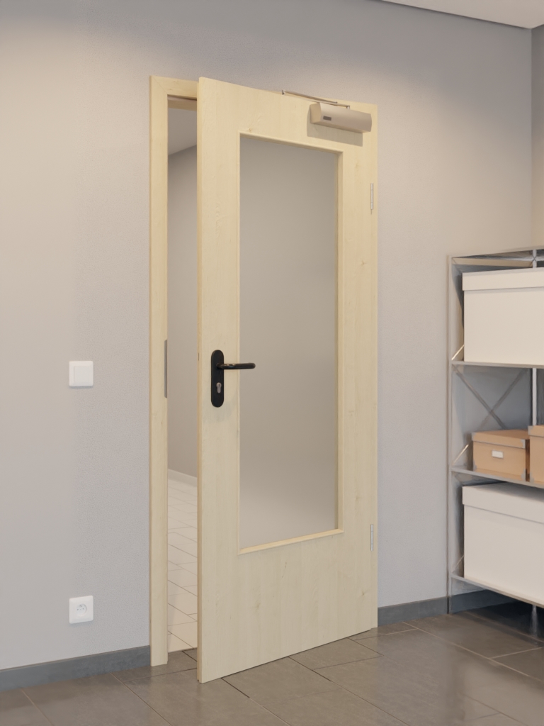 Standardowy zakres dostawy obejmuje skrzydło drzwiowe, klamkę z tworzywa sztucznego, zamek PZ, dwa trzyczęściowe zawiasy, samozamykacz drzwiowy górny i opuszczaną uszczelkę podłogową.