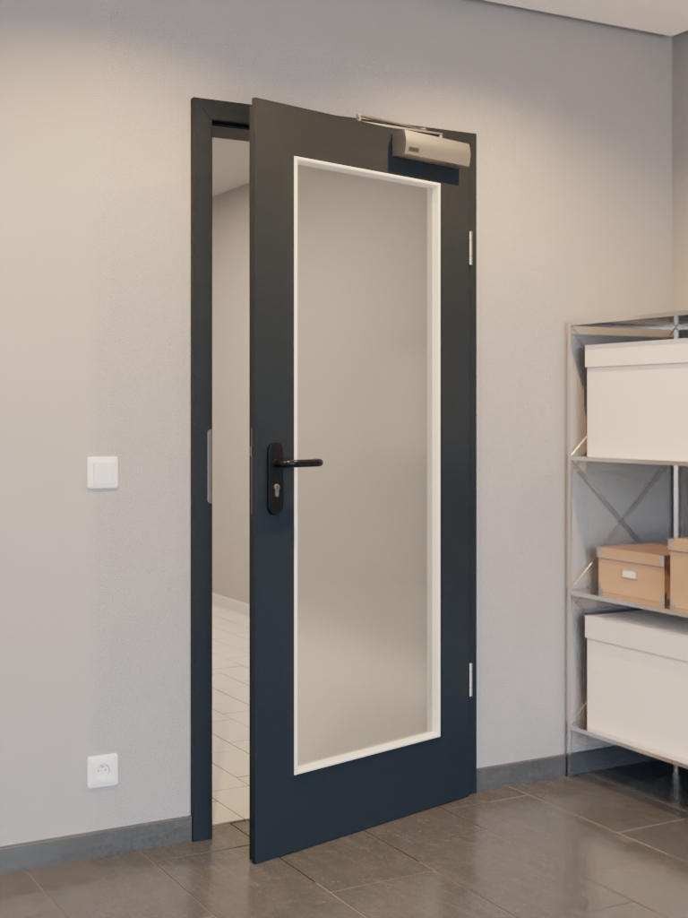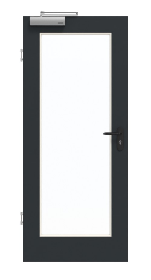 • Zakres dostawy: Skrzydło drzwiowe, zawiasy, zamek cylindryczny, przeszklenie, samozamykacz, obniżana uszczelka podłogowa, czarny plastikowy uchwyt.