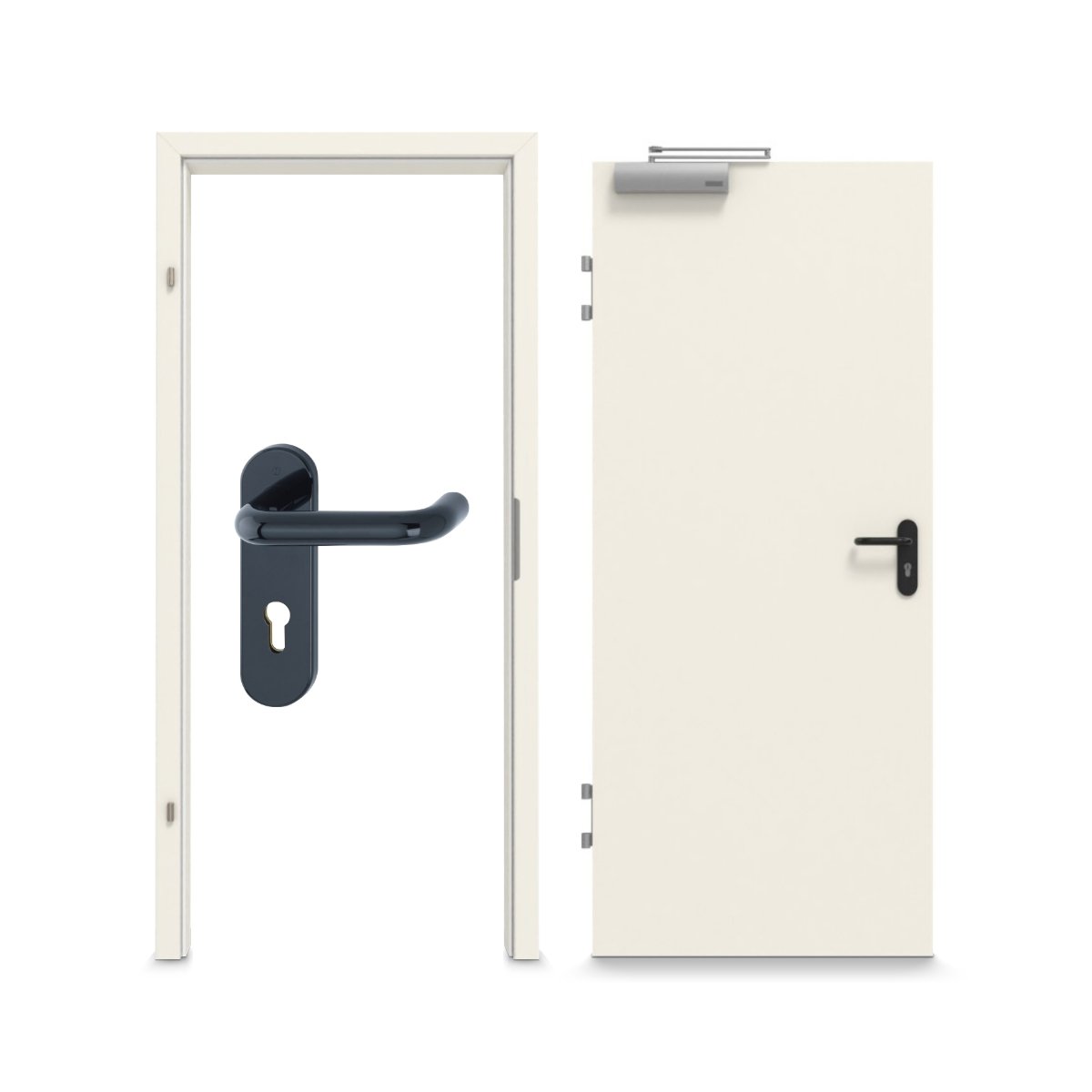 W cenie zawarte są skrzydło drzwiowe, ościeżnica i klamka. W standardowym zakresie dostawy znajdują się również samozamykacz górny, opuszczana uszczelka podłogowa, zamek cylindryczny oraz dwa zawiasy obiektowe.