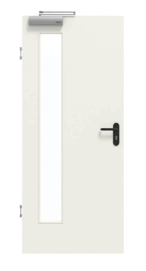 Wnętrze drzwi tworzy rama z litego drewna ze stabilizatorem oraz płyta wiórowa pełna. Konstrukcję wieńczy zaokrąglona warstwa wierzchnia z płyty HDF o grubości 3 mm. Zgodnie z normą DIN 18095 dotyczącą drzwi dymoszczelnych, kompletny zestaw uzupełnia samozamykacz drzwiowy górny i opuszczana uszczelka podłogowa.