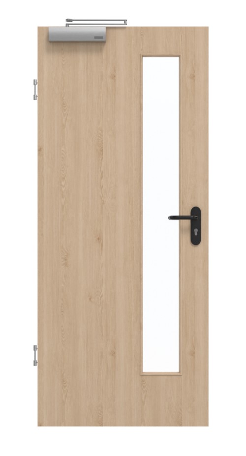 Konstrukcja składa się z ramy z litego drewna ze stabilizatorem, płyty wiórowej pełnej oraz płyty HDF o grubości 3 mm i wysokiej gęstości jako warstwy wierzchniej. W połączeniu z samozamykaczem drzwiowym górnym i opuszczaną uszczelką podłogową drzwi spełniają wymagania normy DIN 18095 dotyczącej drzwi dymoszczelnych.