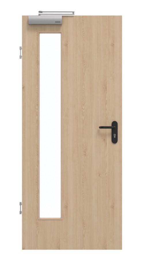 Konstrukcja składa się z warstwy wierzchniej z płyty HDF na płycie wiórowej pełnej w stabilizującej ramie z litego drewna. Zestaw jest uzupełniony zgodnie z normą DIN 18095 dla drzwi dymoszczelnych o samozamykacz drzwiowy górny i opuszczaną uszczelkę podłogową.