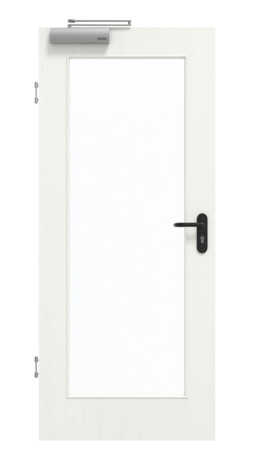 Stabilność pomieszczenia wewnętrznego zapewnia konstrukcja z ramy z drewna litego ze stabilizatorem i płytą wiórową pełną. Jako warstwa wierzchnia stosowana jest płyta pilśniowa o grubości 3 mm i wysokiej gęstości. Wraz z samozamykaczem drzwiowym górnym i uszczelką dolną drzwi spełniają wymagania normy DIN 18095 dotyczącej drzwi dymoszczelnych.