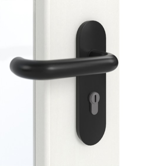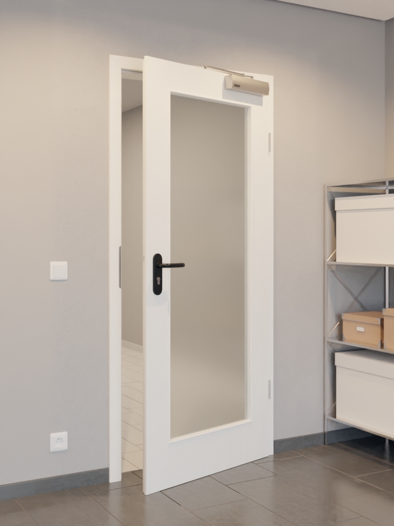 Standardowy zakres dostawy obejmuje skrzydło drzwiowe, klamkę z tworzywa sztucznego, zamek PZ, dwa trzyczęściowe zawiasy, samozamykacz drzwiowy górny i opuszczaną uszczelkę podłogową.