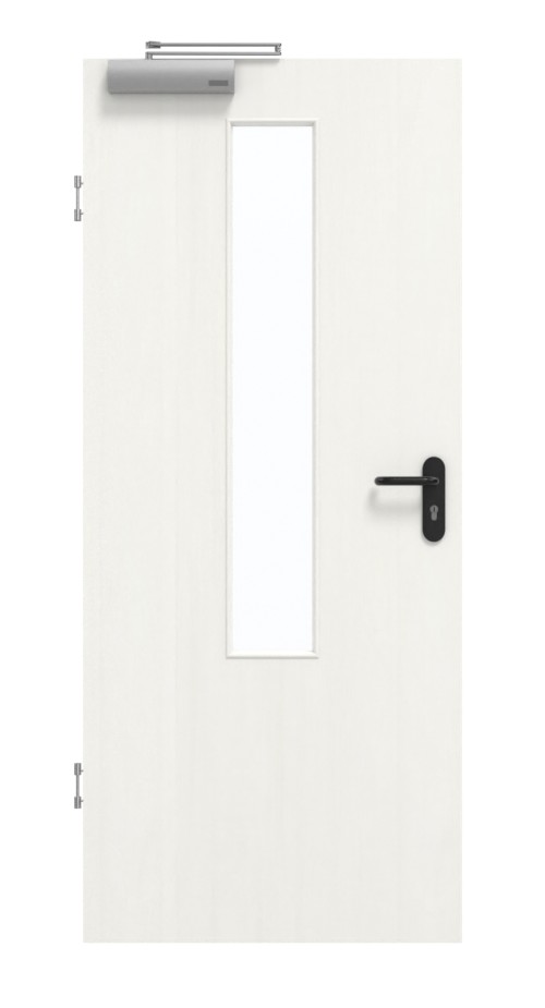 Skrzydło drzwiowe, zawiasy, zamek cylindryczny, przeszklenie, samozamykacz, obniżana uszczelka podłogowa, czarny plastikowy uchwyt.