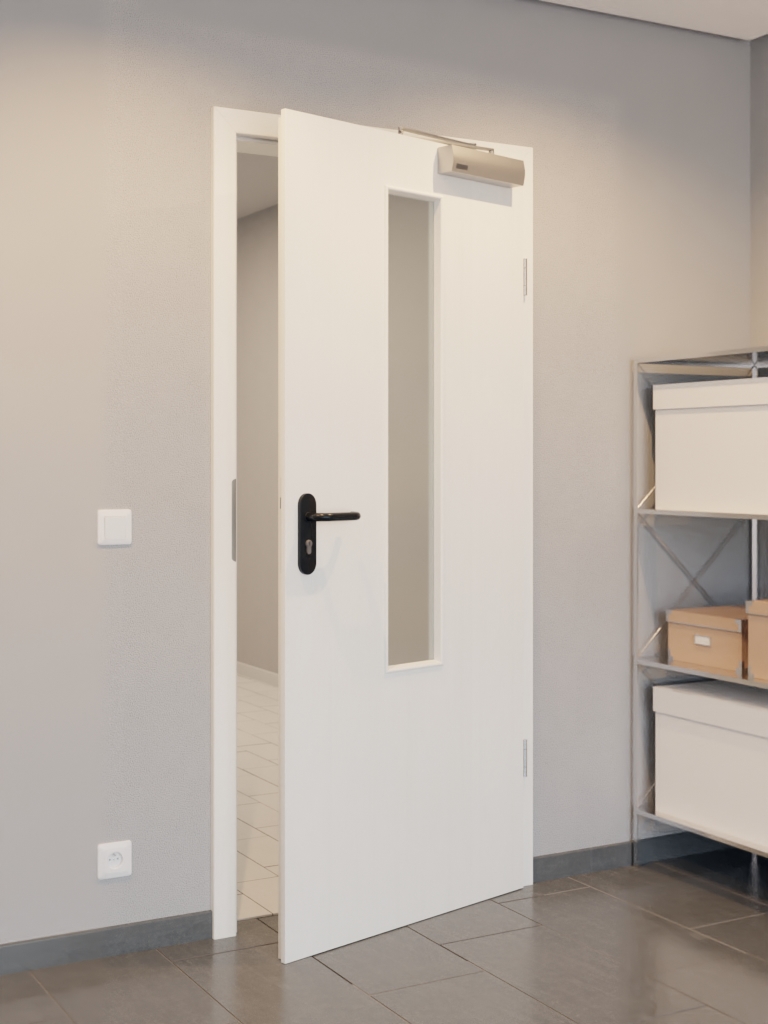 Standardowy zakres dostawy obejmuje skrzydło drzwiowe, klamkę z tworzywa sztucznego, zamek PZ, dwa trzyczęściowe zawiasy, samozamykacz drzwiowy górny i opuszczaną uszczelkę podłogową.