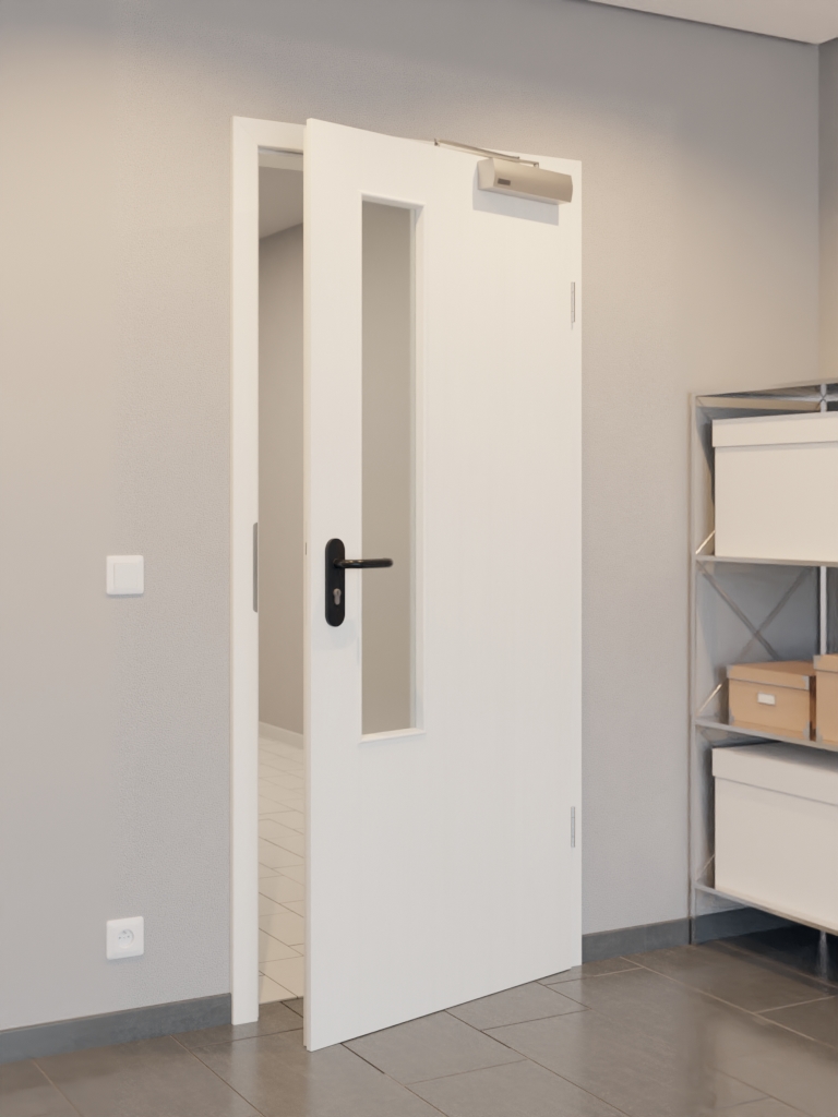 W pomieszczeniu wewnętrznym drzwi znajduje się solidna płyta wiórowa pełna w ramie z litego drewna ze stabilizatorem. Warstwa wierzchnia składa się z płyty HDF o grubości 3 mm. W połączeniu z samozamykaczem drzwiowym górnym i opuszczaną uszczelką podłogową drzwi spełniają wymagania normy DIN 18095 dla drzwi dymoszczelnych.