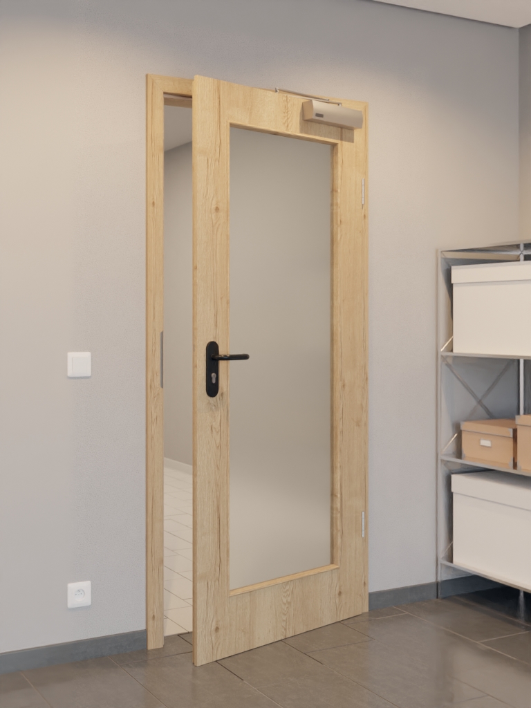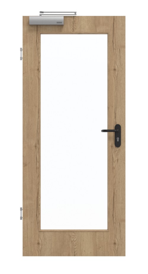 Skrzydło drzwiowe, zawiasy, zamek cylindryczny, przeszklenie, samozamykacz, obniżana uszczelka podłogowa, czarny plastikowy uchwyt.