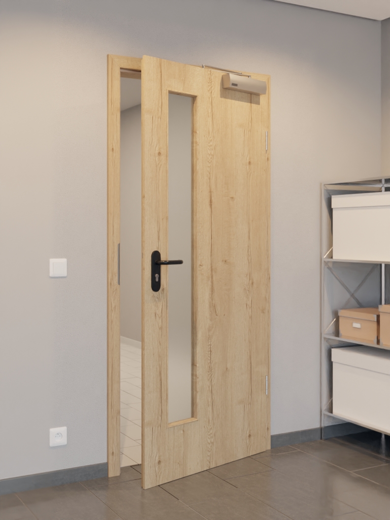 Skrzydło drzwiowe, zawiasy, zamek cylindryczny, przeszklenie, samozamykacz, obniżana uszczelka podłogowa, czarny plastikowy uchwyt.