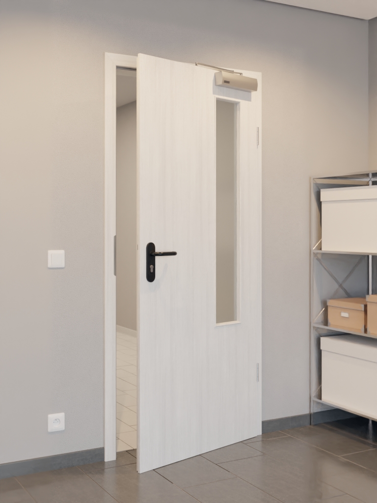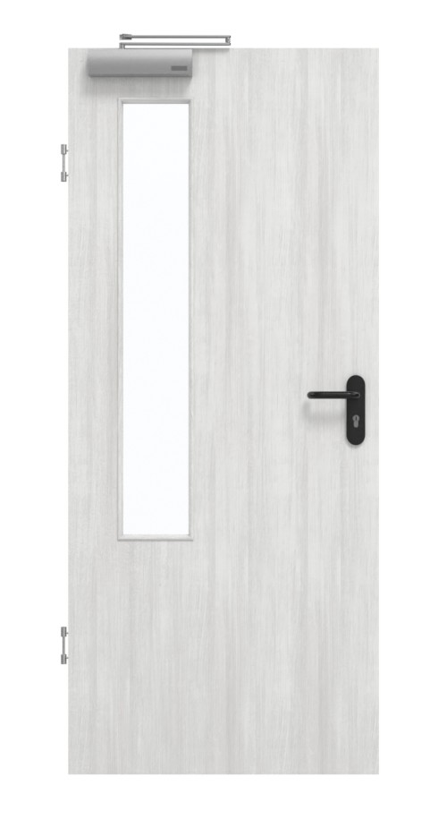 W górnej części drzwi znajduje się krótkie okno szklane po stronie zawiasów. Jasnoszary odcień z delikatnymi cieniowaniami rozciąga się od góry do dołu na skrzydle drzwi. Dzięki swojej solidności, łatwa w czyszczeniu powierzchnia CPL jest odporna na zarysowania i uderzenia.