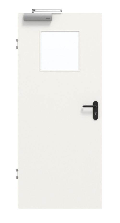 Stabilne drzwi przeciwpożarowe w białym kolorze z opadającą uszczelką podłogową: