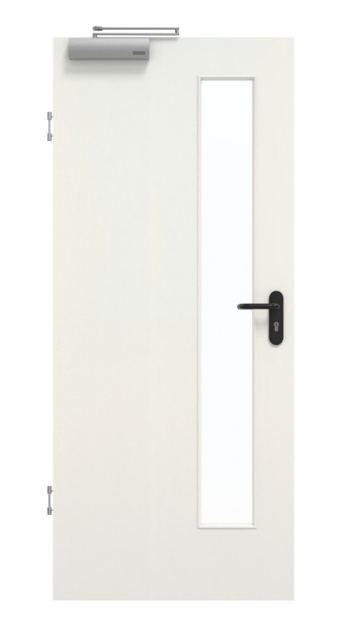 Skrzydło drzwiowe, zawiasy, zamek cylindryczny, przeszklenie, samozamykacz, obniżana uszczelka podłogowa, czarny plastikowy uchwyt.