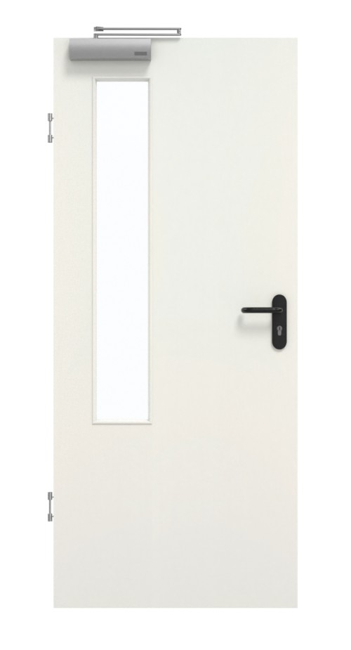 Wyposażona w warstwę wierzchnią HDF na płycie wiórowej pełnej w ramie z litego drewna wraz ze stabilizatorem, konstrukcja ta okazuje się być zaawansowana technicznie. Zgodnie z normą DIN 18095 dotyczącą drzwi dymoszczelnych konstrukcję uzupełnia samozamykacz drzwiowy górny i opuszczana uszczelka podłogowa.