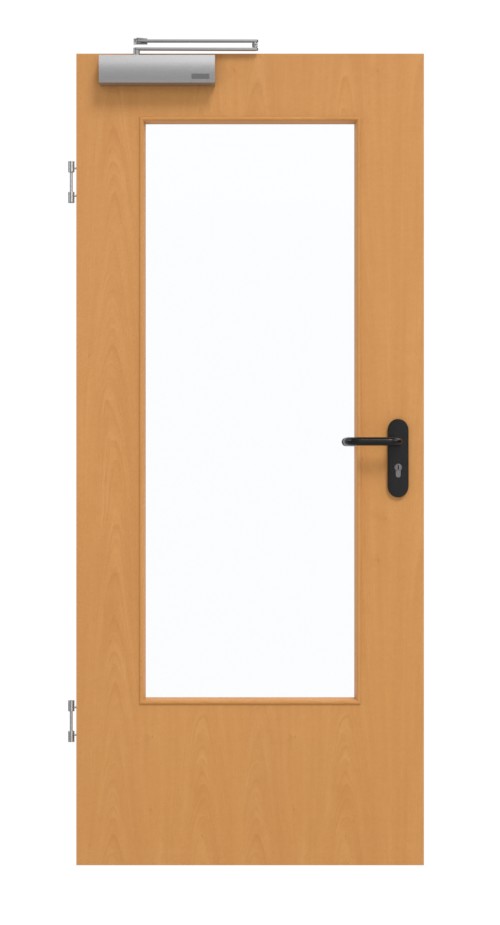 Skrzydło drzwiowe, zawiasy, zamek cylindryczny, przeszklenie, samozamykacz, obniżana uszczelka podłogowa, czarny plastikowy uchwyt.
